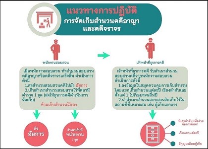 แนวทางการจัดเก็บสำนวนการสอบสวนคดีอาญาและคดีจราจรให้หัวหน้างานสอบสวนมีหน้าที่เก็บรักษาไว้ในห้องหรือตู้ที่จัดทำไว้โดยเฉพาะให้อยู่ในสภาพเรียบร้อย และระมัดระวังมิให้สูญหาย จัดการเก็บสำนวนการสอบสวนและสำเนาสำนวนการสอบสวน ให้แยกเป็นสัดส่วน ได้แก่